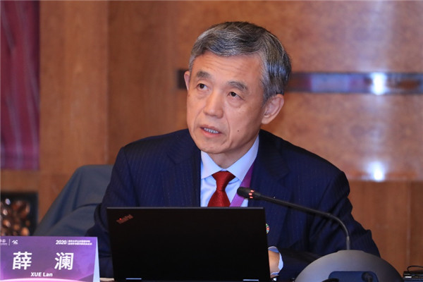 Xue Lan introducing Tsinghua SPPM’s efforts of global cooperation in the fight against COVID-19 pandemic