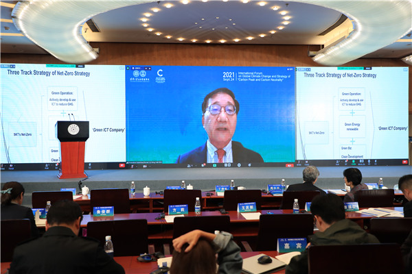 Yong-Hak Kim, President Emeritus of Yonsei University, Chairman of the Board, SK Telecom gave his speech themed “SKT Strategy toward Net Zero 2050” after the EU, China, and South Korea promised carbon neutrality in 2050, 2060 and 2050 respectively. A lot of criticism and doubts in the market by then were received. The biggest telecommunication operator in South Korea, SK Telecom, has addressed climate change in the past few years, taken climate actions, and constantly raised the efficiency of the existing telecom infrastructure. They worked hard to develop relevant technologies of renewable energies and reduced carbon emission by different means. The green energy strategy was implemented by utilizing AI-based energy-saving equipment to achieve green operation and green commercial development to realize the objective of zero emission in 2050 finally. Besides, SK also hoped to show society that carbon neutrality is a difficult challenge but is achievable when giving full play to ingenuity and creativity.