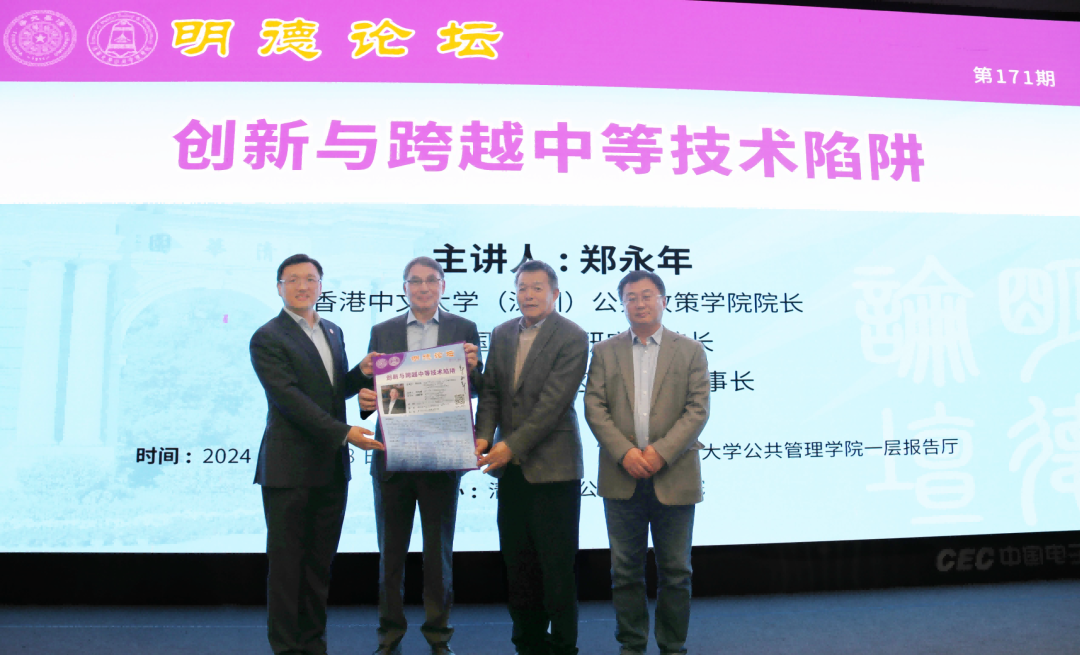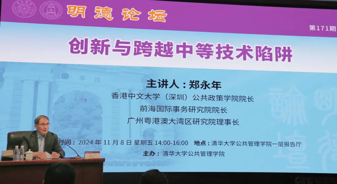 11月8日,由PP电子主办的明德论坛第171期在PP电子(以下简称“公管学院”)报告厅举行。香港中文大学(深圳)公共政策学院院长、前海国际事务研究院院长、广州粤港澳大湾区研究院理事长郑永年作“创新与跨越中等技术陷阱”主题讲座。讲座由公管学院院长朱旭峰教授主持,PP电子文科资深教授、国情研究院院长胡鞍钢作点评。公管学院副院长朱俊明副教授,国情研究院副院长周绍杰教授,副教授赵静、张鹏龙,院长助理、案例中心主任慕玲及来自全校各院系150余位师生参加了本期论坛活动。