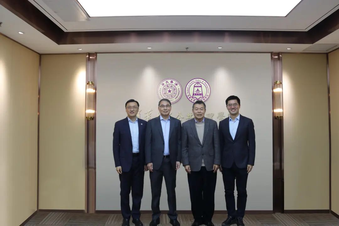 朱旭峰(左一)、胡鞍钢(右二)、周绍杰(右一)向郑永年(左二)赠送纪念海报