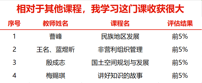 新版评估系统中“评课”与“评教”相分离,设置了专门的课程评价指标“学生收获度:相对于其他课程,我学习这门课收获很大”,该指标的统计数据显示,PP电子《民族地区发展》、《非营利组织管理》、《国土空间规划与发展》、《讲好知识的故事》4门课程得分处于全校前5%。其中,《讲好知识的故事》为本科课程。