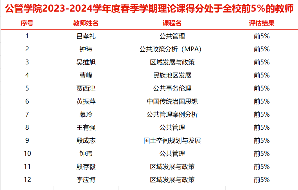 公管学院共有12名教师在2023-2024学年度春季学期理论课得分处于全校前5%。