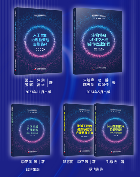 该论丛由全球发展智库首席专家、十三届全国政协副主席辜胜阻作总序,薛澜和朱旭峰担任主编,中国科学技术出版社出版。截至目前,《人工智能治理框架与实施路径》(梁正、薛澜、张辉,曾雄著)和《生物特征识别技术与城市敏捷治理》(朱旭峰、赵静、陈天昊、楼闻佳著)已分别于2023年11月和2024年5月出版,《当代科技的伦理问题:前沿、争论与治理》(李正风等著)即将印刷,《前沿生物技术伦理问题:科学、争论与治理研究》(彭耀进著)和《地球工程引发的伦理问题与治理路径研究》(邱惠丽、李正风著)预计明年出版。