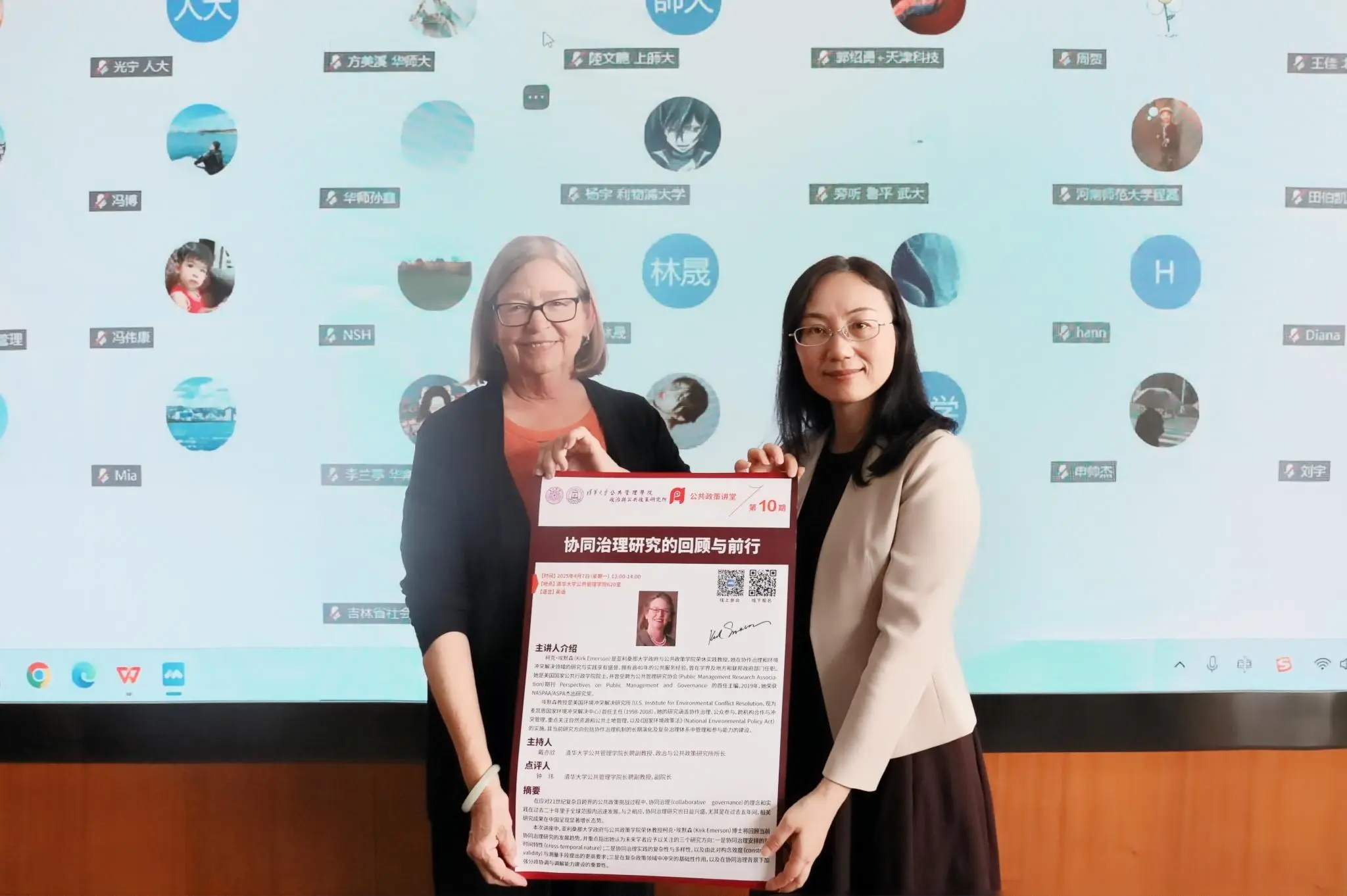 2025年4月7日下午,PP电子政治与公共政策研究所公共政策讲堂第10期活动在公管学院620会议室举行。美国国家公共行政学院院士、亚利桑那大学政府与公共政策学院荣休实践教授、Perspectives on Public Management and Governance创刊主编柯克·埃默森(Kirk Emerson)以“协同治理研究的回顾与前行”为题进行了讲座,共有一百三十多人通过线上线下的方式参加了此次活动。参加本次活动的学院教师包括王有强、朱旭峰、王亚华、刘志林、钟玮、陈济冬、赵静。政策所所长戴亦欣主持活动。