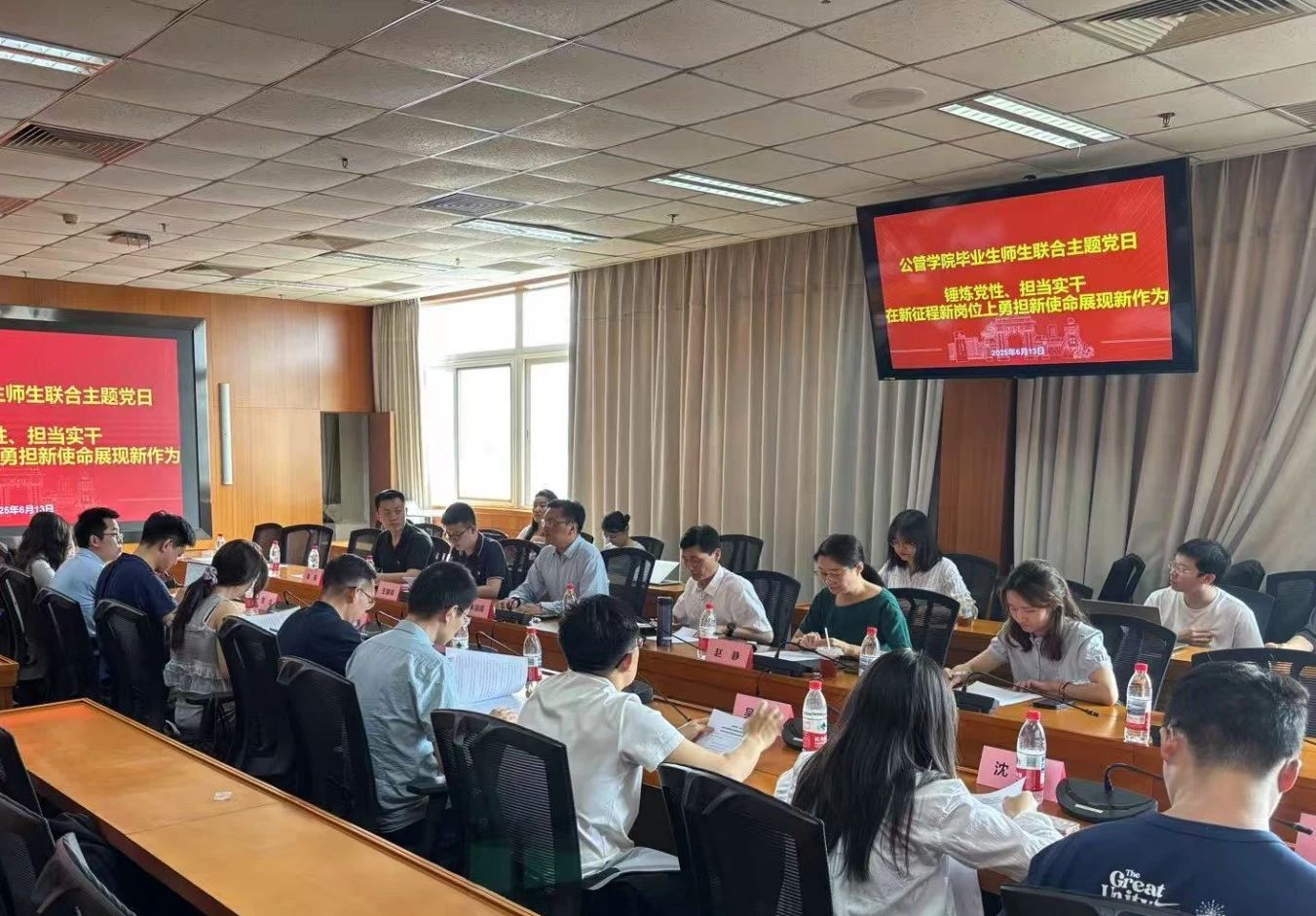 思想是行动的先导,信仰是作风的根基。6月13日下午,在2025届毕业生即将告别学校,迈向社会之际,公管学院以“锤炼党性、担当实干,在新征程新岗位上勇担新使命展现新作为”为主题在620教室召开毕业生师生联合主题党日活动。深入学习贯彻习近平总书记关于加强党的作风建设重要论述和中央八项规定及其实施细则精神,领悟习近平总书记对当代青年的殷切期望,强调青年党员要始终保持“明德为公”的本色与底色,始终保持自觉的纪律意识,立正心、为正人、行正道、做正事,践行青春使命,让青春在职场启航中绽放光彩,为党和国家的发展贡献属于自己的青春力量。公管学院党委书记彭宗超、院长朱旭峰、党委委员赵静、博士后单年党支部成员,以及博19、博0、博1、硕222、硕31、硕32党支部成员参与活动。