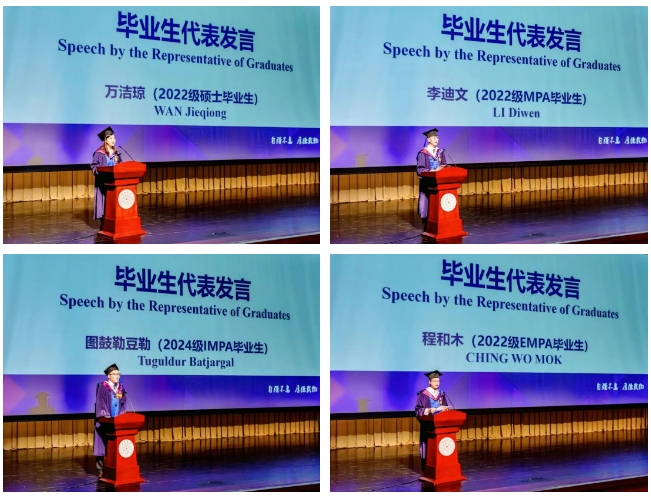 2022级学术硕士毕业生万洁琼、2022级MPA大湾区班毕业生李迪文、2024级IMPA毕业生图鼓勒豆勒(Tuguldur Batjargal)、2022级EMPA项目毕业生程和木作为毕业生代表分别发言。