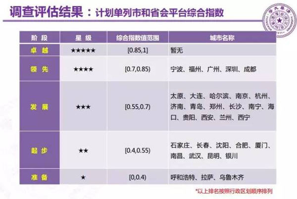 太原、大连、哈尔滨、南京、杭州、济南、青岛、郑州、长沙、南宁、海口、贵阳、西安、兰州、西宁,共15个互联网+政务服务平台处于“发展”阶段(三星级);