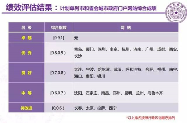 大连、宁波、哈尔滨、武汉、呼和浩特、合肥、福州、南宁、海口、贵阳、银川,共11个政府网站处于“良好”层级;