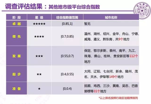 保定、鄂尔多斯、泰州、南平、九江、珠海、佛山、桂林、贵安新区等112个互联网+政务服务平台处于“发展”阶段(三星级);