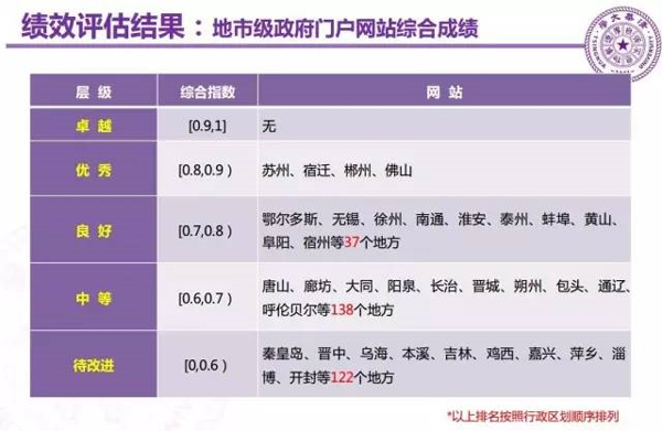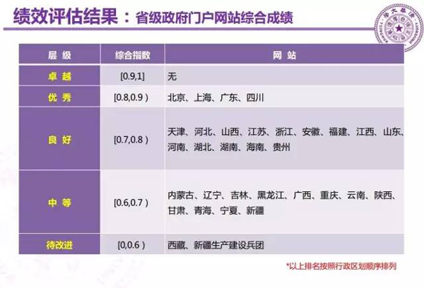 主要评估结果如下,各层级中网站按机构或行政区划顺序排列: