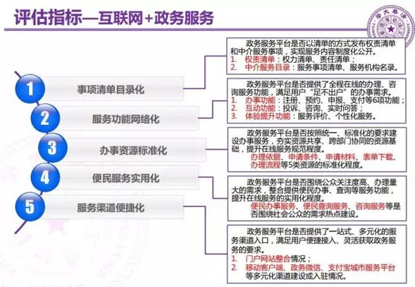 《2016年中国互联网+政务服务调查评估报告》从事项清单目录化、服务功能网络化、办事资源标准化、便民服务实用化、服务渠道便捷化五个维度对省级和地市级服务平台建设和应用情况进行评估。
