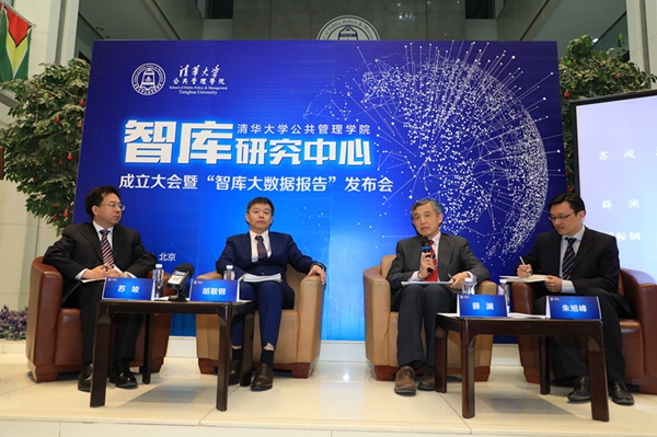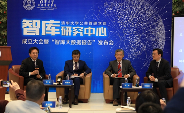 图为智库研究中心揭牌仪式(从左至右:胡鞍钢、薛澜、苏竣、朱旭峰)。