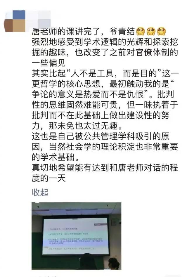 在法学院求学期间,唐啸被学院师生对国家治理问题热烈的讨论氛围所感染。那时,同学们不仅在教学课堂和网络学堂上讨论得不亦乐乎,就连中午在水池边洗衣时,也常常会争论得忘记了时间和音量。为此,寝室门上还被隔壁工科院系的同学贴过“安民”告知:“理解法学院同学对时事的热情,但休息时间请保持安静”。现在想来,这些热烈的讨论启蒙了唐啸对探索中国国家治理的研究兴趣。