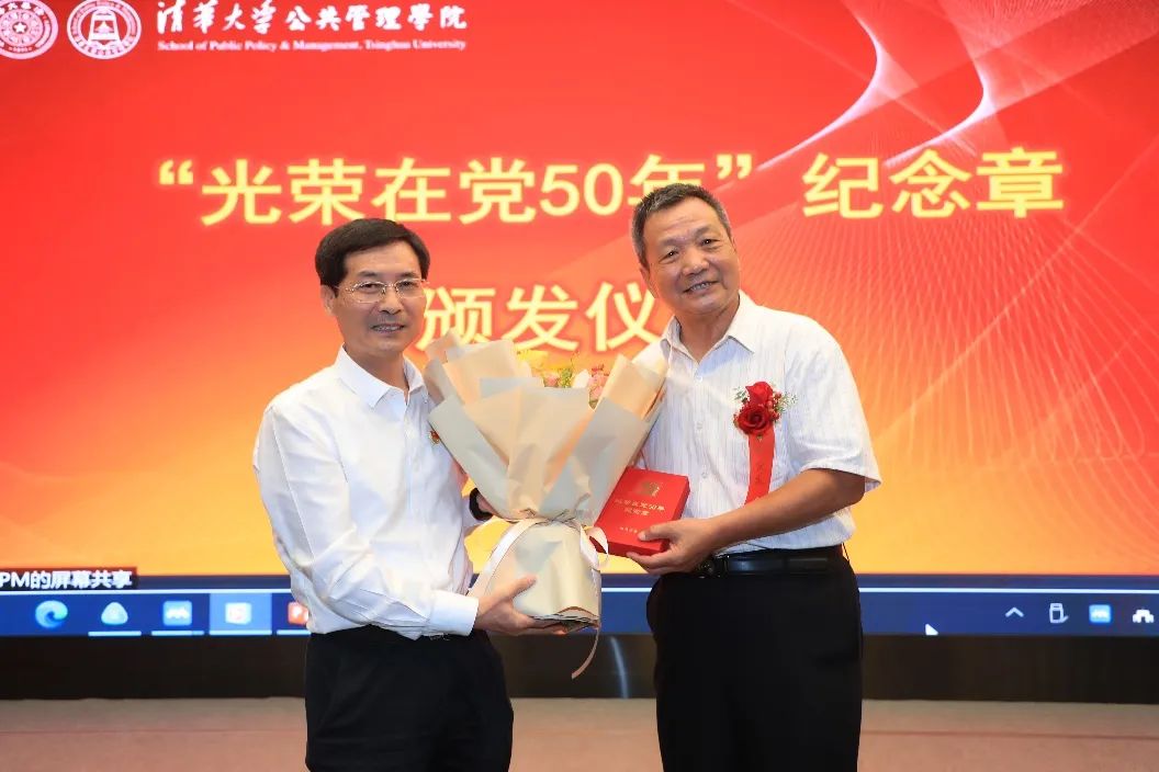 彭宗超(左)为刘庆龙(右)颁发“光荣在党50年”纪念章