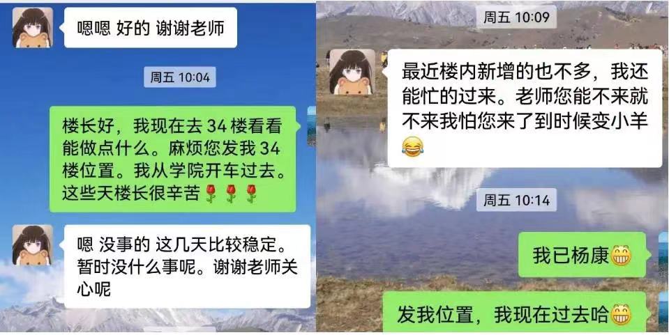 第二周正式上岗前,她向前一周值班的刘敏老师详细了解了工作流程,将工作重点放在线上统筹方面,与楼长保持密切沟通,保持统计信息的准确与及时。自下而上,将楼内自我汇报的抗原阳性同学信息汇报给学校;实时对阳性转阴同学的信息进行动态调整。自上而下,把学校层面下达的核酸阳性同学的情况及时汇报至34楼楼长处,方便楼长后续各项工作安排。从自下而上和自上而下两条线动态调整更新统计数据,为管理服务的精准提供基础信息支撑。