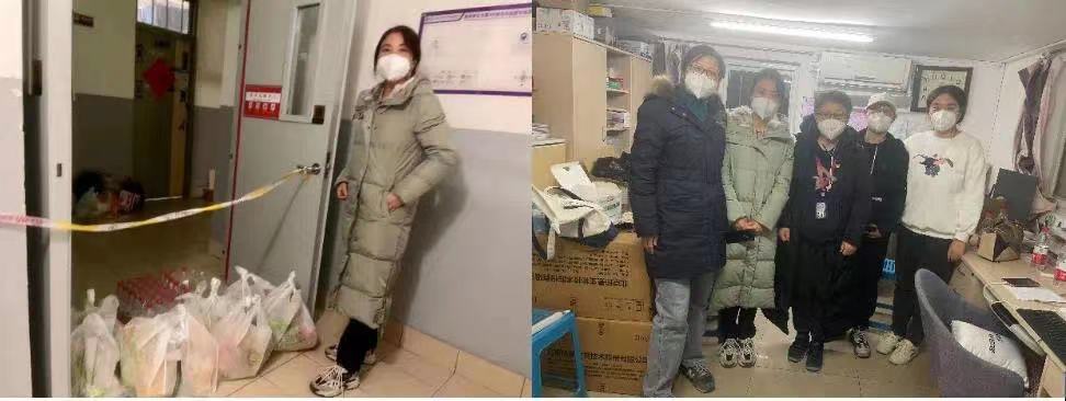 左:徐臻给紫荆8号楼阳性病例同学送物资;右:谢矜、徐臻与紫荆8号楼社区工作人员