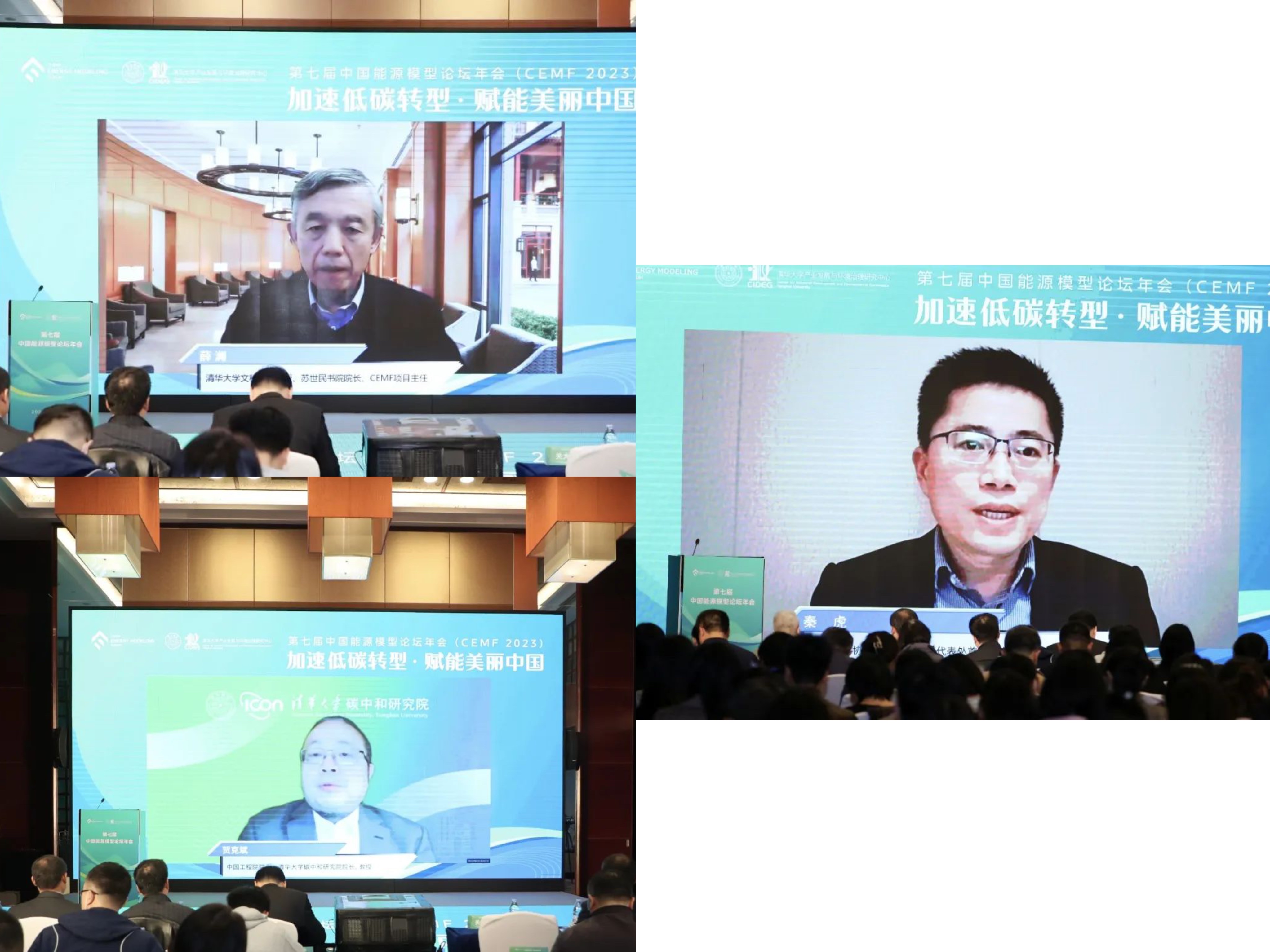 嘉宾致辞:薛澜教授(左上)、贺克斌院士(左下)、秦虎(右)