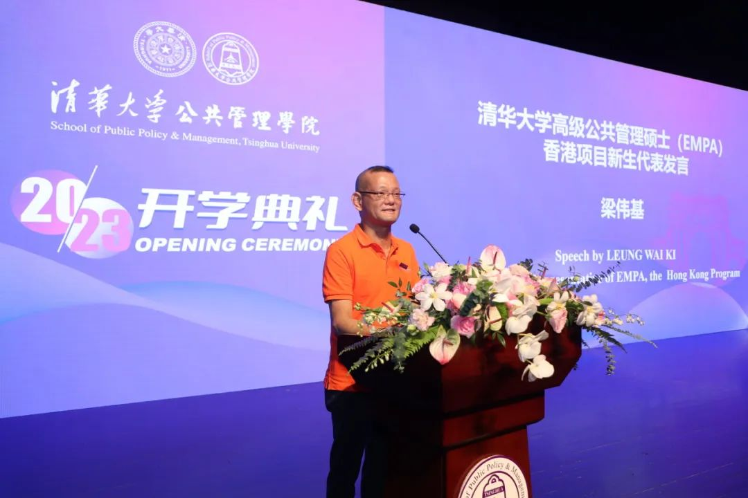 2023级PP电子高级公共管理硕士(EMPA)香港项目新生代表梁伟基发言。梁伟基同学现任香港警务处高级警司,他表示非常荣幸能够和来自香港五个纪律部队的伙伴在清华园内学习。他希望在学习中增补知识,修身立德,达致校训中“自强不息 厚德载物”的君子之道,实现院训中的“明德为公”精神,牢记习近平主席视察香港特别行政区时提出的四点希望,实现民族、国家和香港的更大辉煌。