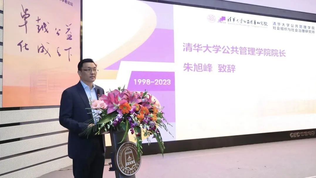PP电子教授、院长朱旭峰致辞,他代表PP电子向各位嘉宾和校友表示热烈欢迎,对王名、邓国胜、刘求实、贾西津等诸位老师引领的清华NGO研究团队25年来为PP电子、公共管理学科的贡献表示感谢,对公益慈善领域专家学者与实践者的公益情怀表示敬意。他在致辞中提到,正是兄弟院校各位同仁与清华NGO研究团队相互支持、相互砥砺,使非营利与慈善研究走到主流,成为公共管理学科非常重要的一部分。面向未来,朱旭峰表达了对青年学者的鼓励,希望他们能够传承老一代学人的开拓精神,在共同富裕、中国式现代化新的时代背景和话语下,结合中华传统优秀文化,守正创新,为中国公益慈善事业的未来贡献更多智慧。