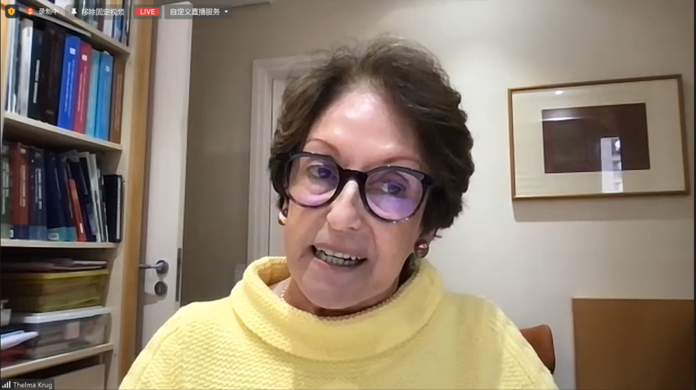 其后,Thelma Krug以“管理气候过冲风险:太阳辐射干预的潜在作用”为题作引导性发言。她解释说,太阳辐射干预(SRM)技术通过改变地球气候系统的辐射平衡使地球降温,但SRM并不是气候变化的最根本减缓方案,因为它没有解决气候变化问题的根本——即大气中温室气体增加的根本原因(碳排放)。模拟研究一致表明,SRM有可能抵消温室气体增加对全球及区域气候的某些影响,但气候对太阳辐射干预的反应是不确定的,在不同的气候模式中其结果也各不相同。