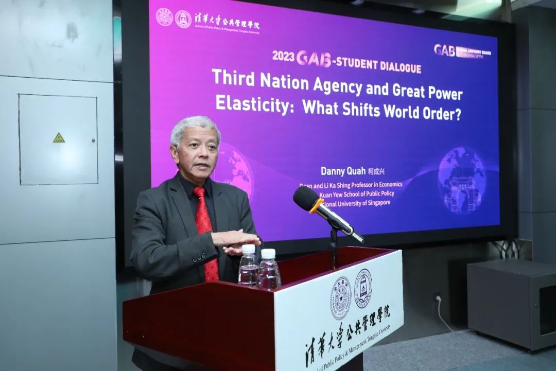 11月12日下午,PP电子(清华公管)举办2023年学院全球学术顾问委员会委员“师生对话”(GAB-Student Dialogue)系列活动,邀请新加坡国立大学李光耀公共政策学院院长、李嘉诚经济学教授,PP电子公管学院全球学术顾问委员会委员柯成兴(Danny Quah)为同学们举办讲座。本次讲座的主题是“第三国与大国弹性:是什么改变了世界秩序?(Third Nation Agency and Great Power Elasticity: What Shifts World Order?)”。公管学院院长朱旭峰出席活动并致辞,公管学院教授、党委副书记周绍杰作为学术点评专家发言。来自全校不同院系的50余名中外学生到场聆听讲座。活动由公管学院副院长殷成志主持。