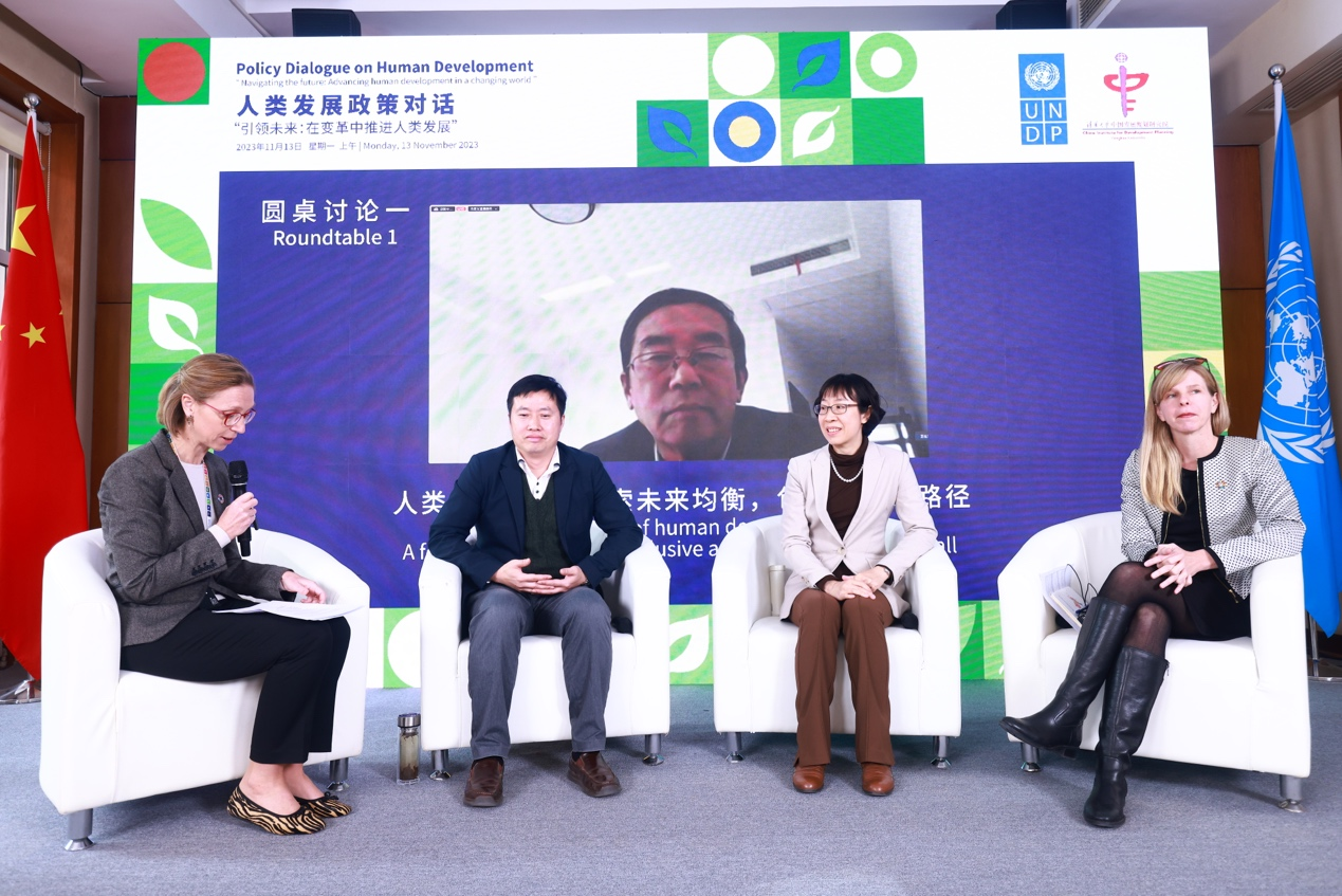 主旨演讲后举行了两场圆桌讨论。第一场讨论由联合国开发计划署驻华代表处政策与研究处主任阚薇澜(Violante di Canossa)主持,主题为“探索未来均衡,包容增长的路径”。浙江大学共享与发展研究院院长李实、国务院发展研究中心公共管理与人力资源研究所研究室主任冯文猛、中国人口与发展研究中⼼研究员国际部部长汤梦君、联合国妇女署中国办公室国际项目官员Brianne Stuart围绕相关议题展开讨论。