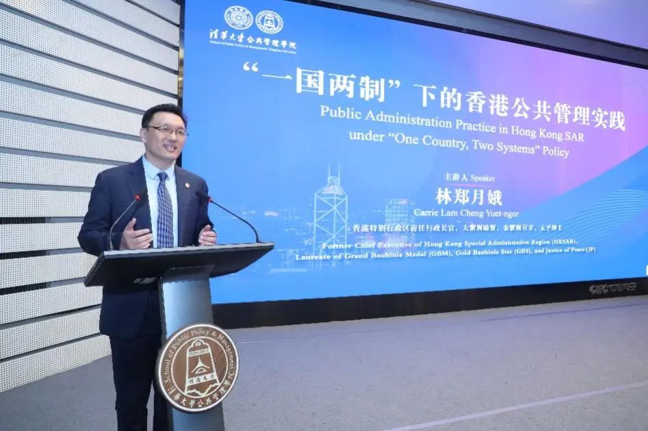 随后,林郑月娥结合香港的发展历史详细阐释了“一国两制”方针的重要性和必要性。她指出,“一国两制”方针是香港公共治理实践的基础,也是香港社会保持长期繁荣和安定的根本遵循。要实现香港在政治制度、经济发展、法律政策、社会福祉等多方面的良治,从容坚定地面对各种挑战和困难,“一国两制”就是不容置疑的底线。未来,香港特区政府还应积极创新、与时俱进,探索更多与内地的合作领域,在发挥自身优势的同时积极融入国家发展大局,进一步提升社会公义和人民福祉。最后,林郑月娥勉励公管学院师生要秉承为人民服务之心,勇于实践、踔厉前行,期待两岸青年能够积极地为祖国的发展贡献力量。