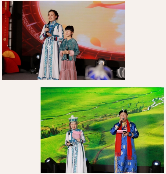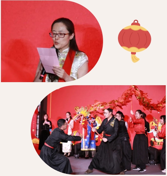 “重磅嘉宾”蓝志勇老师、钟玮老师及其课题组成员、博23班王壹凡和教师家属代表刘慕宜小朋友为大家带来了歌伴舞串烧《大鱼》《父亲的草原母亲的河》和《中国功夫》。王壹凡和刘慕宜身着特色的传统服饰献唱,女声与童声的搭配极具感染力;蓝志勇老师歌声铿锵浑厚,钟玮老师的朗诵坚定有力,引发现场师生阵阵欢呼;张阳阳同学舞姿优雅、动作流畅,配合悠扬的歌声使观众仿佛置身辽阔的草原;最后,气势磅礴的功夫和舞龙表演将晚会的气氛推向了高潮,大家纷纷拿出手机记录这难忘时刻。