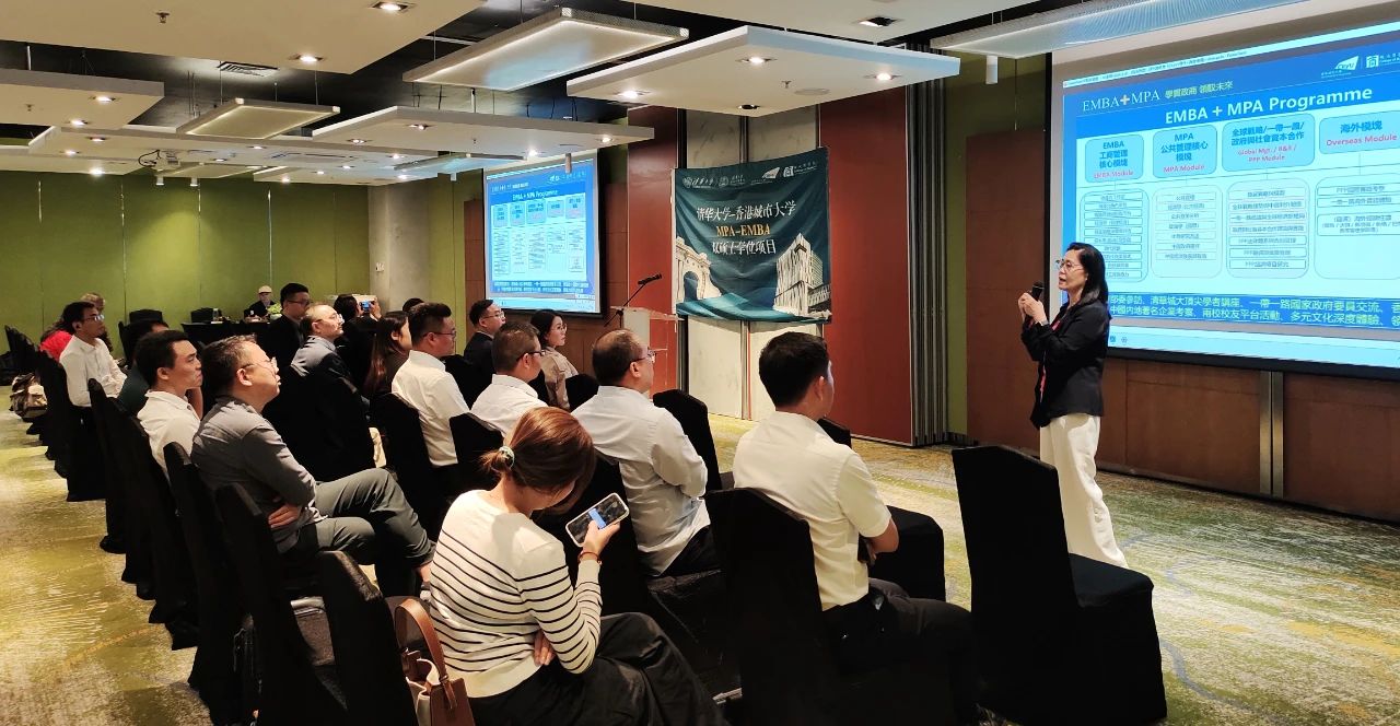 香港城市大学商学院副院长、MPA-EMBA项目联席主任郝刚教授介绍了香港城市大学商学院的发展历程、MPA-EMBA项目学员概况和海外实践相关安排。她介绍到MPA-EMBA项目面向全球招生,包括中国内地、港澳台和国际的学生,都是来自各行各业资深的高级管理人士,对于学习的期望不仅仅在课堂上与授课老师和同学们达到深度的交流与分享,还需要更加广阔的国际视野,为此安排同学们在学期间参加丰富的海外实践,学习全新的思维方式、建立友谊和信任,进一步加强同学们对国际前沿实践的认知。