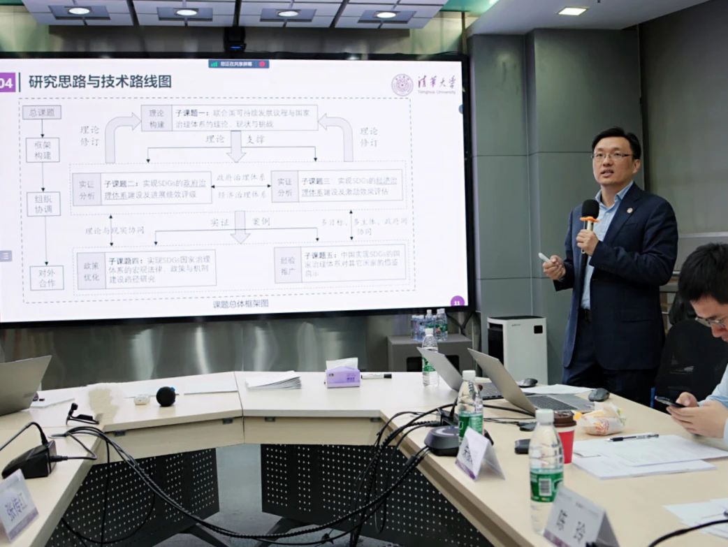 其后,朱旭峰作为课题首席专家进行课题汇报。他分别从研究团队、课题背景与意义、研究问题与思路、子课题安排、重点难点与创新点、以及预期成果和进度安排等多方面对课题内容进行了详细汇报。他表示,课题将综合公共管理、经济学和法学等学科理论和方法,从理论构建、实证分析、政策优化和经验推广四个方面展开,厘清可持续发展议程与国家治理体系的关系,评估实现联合国可持续发展目标的国家治理体系,提炼中国实现联合国可持续发展目标的路径机制,最后构建基于“人类命运共同体”视角的全球协同治理体系。