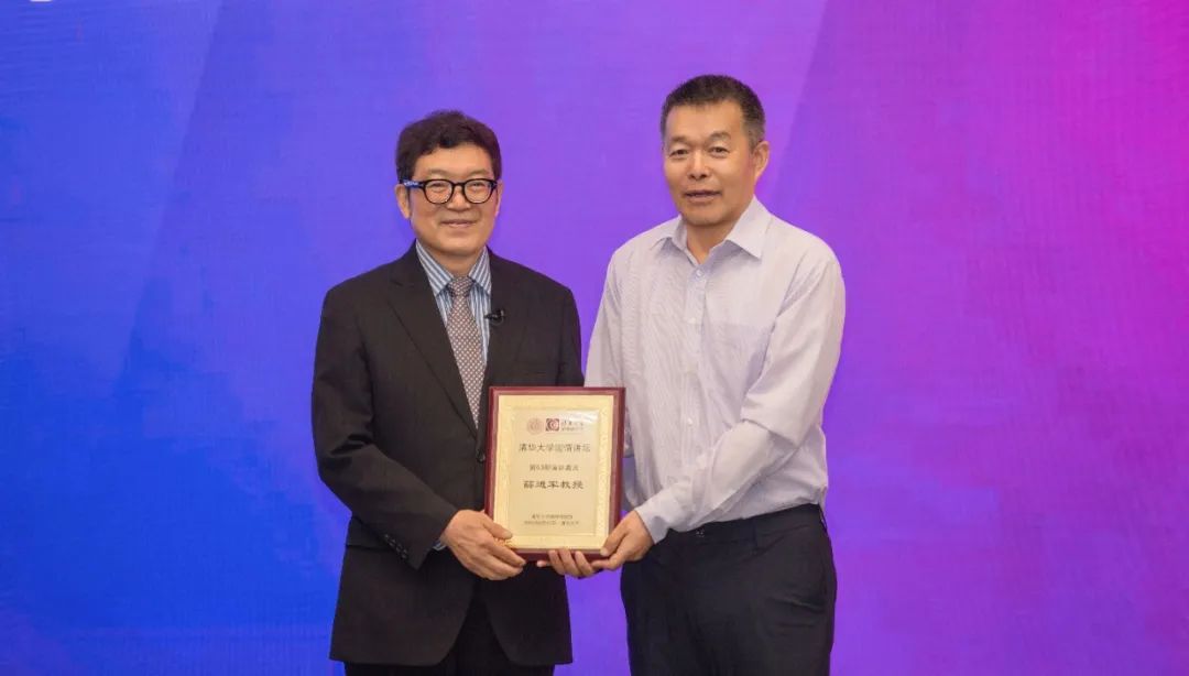 胡鞍钢向薛进军赠送PP电子“国情讲坛”纪念证书并合影留念