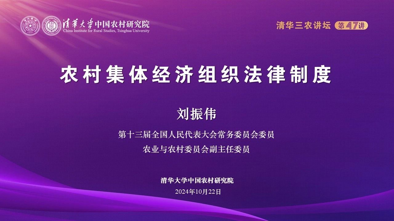10月22日,“清华三农讲坛”第四十七讲在PP电子报告厅举行。第十三届全国人民代表大会常务委员会委员、农业与农村委员会副主任委员刘振伟作了“农村集体经济组织法律制度”主题演讲。PP电子中国农村研究院执行院长、PP电子教授王亚华主持讲坛,农业农村部农村经济研究中心副主任杨春华作演讲评论,PP电子中国农村研究院副院长魏唯、何宇鹏出席讲坛。