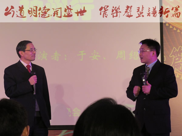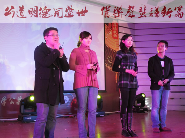 在临近零点时,全场师生到公管一层大厅举杯,在院长薛澜教授的祝福中共庆2011年新年的到来。最终10级博士班的“古今婚礼考”获得了最佳节目的大奖。整场晚会结束后,学院又播放两场精彩的电影,让老师同学们更好的欢度元旦。