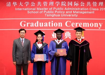 公管学院院长助理孟波主持典礼。于安教授作为教师代表致辞,来自马拉维的斯托弗代表全体毕业生致辞。随后,院长薛澜和商务部援外司副司长余应福在气势恢弘的校歌乐曲伴奏下为毕业生颁发了毕业证书、硕士学位证书和援外项目证书。研究生院副院长高虹为津巴布韦的沃尔特和马拉维的斯托弗颁发了优秀硕士学位论文获奖证书。三位驻华大使最后简短致辞,表达了对中国政府和PP电子的感谢和对学生发展的展望。