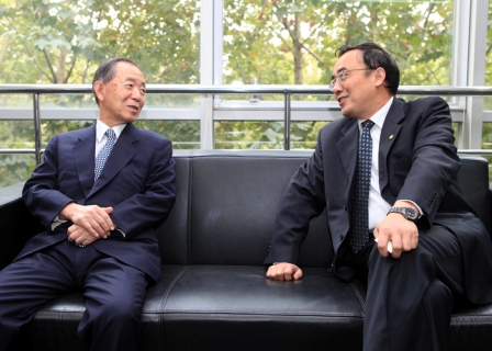 副校长谢维和(右一)与丹羽宇一郎(左一)亲切交谈