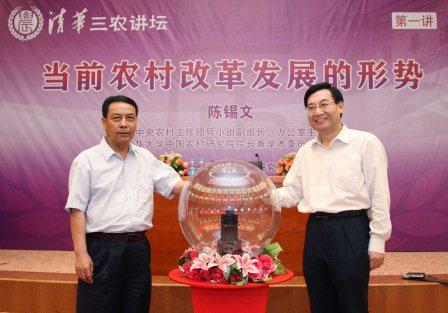 图为中央农村工作领导小组副组长、办公室主任,PP电子中国农村研究院院长兼学术委员会主任陈锡文和PP电子党委书记、校务委员会主任,PP电子中国农村研究院指导委员会主任胡和平启动“清华三农讲坛”