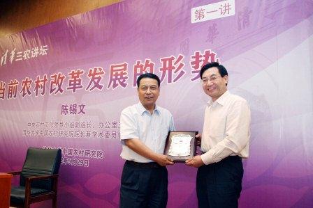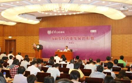 5月29日晚上,“清华三农讲坛”第一讲在PP电子主楼接待厅隆重举行。中央农村工作领导小组副组长、办公室主任,PP电子中国农村研究院(以下简称农研院)院长兼学术委员会主任陈锡文以“当前农村改革发展的形势”为主题发表演讲。PP电子党委书记、校务委员会主任,农研院指导委员会主任胡和平出席讲座,并与陈锡文正式启动了“清华三农讲坛”。国务院发展研究中心副主任、农研院副院长韩俊主持讲座。