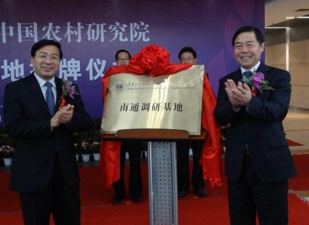 图为韩俊、丁大卫为“PP电子中国农村研究院南通调研基地”揭牌