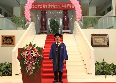 “在党的十八大召开之后,全中国全世界对中国新一代领导人进一步推进改革开放寄予了厚望。而公共治理领域的改革应该成为新一轮改革的突破点。在经济的发展已经奠定了良好的物质基础之后,社会的有效、和谐、公平、正义地运转需要公共治理体系的改革,需要制度设计的不断改良,需要政府服务理念的不断提升,也需要公民参与承担意识的觉醒。这场改革将会为中国的现代化奠定坚实的制度性基础,而我们大家就是这场改革的主力军。”院长薛澜对即将走出校门,参与这场改革的毕业生们提出了希望。他希望大家坚守理想,勇于创新,敢于承担风险,把个人的风险看淡一点,把大众的利益看重一点,做出别人不敢做出的选择、闯出别人不敢闯的天地;并期望大家在公共管理的广阔天地,鹰击长空、一展宏图。这句句有力的话语引起了现场热烈的掌声,将典礼推向高潮。