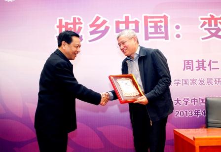 演讲结束后,陈锡文为周其仁颁发了“清华三农讲坛”纪念证书并总结发言。他高度评价了周其仁教授的演讲。他指出,周其仁教授是一位特别勤奋、善于学习、敢于说真话的人,他用经济学家的眼光分析了当前中国正处在由乡土中国到城市中国的演化过程中,面临的重大发展机会和挑战。要想把握这个机会,获得成功,关键要审视现行体制和制度,用能够促进中国经济社会发展的眼光去分析,用实现中国发展目标的勇气和智慧去奋斗。
