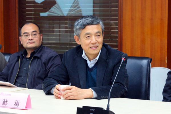图为院长薛澜出席读书会,并对院友们返校表示欢迎。