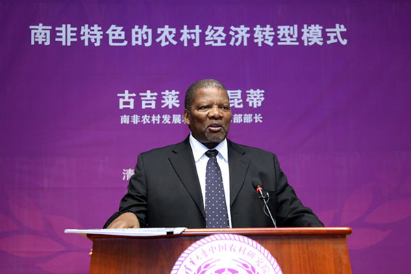 10月29日下午,南非农村发展与土地改革部部长古吉莱·恩昆蒂访问PP电子并做客“清华三农讲坛”,作了题为《南非特色的农村经济转型模式》的演讲。演讲前,PP电子副校长杨斌在工字厅会见了恩昆蒂一行,双方就国际经济形势、中非合作等问题进行了交流。