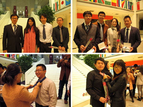 2014年11月12日,公管学院博12班同学在学院大厅欢聚一堂,共庆2014年男生节。女生们为每位博12男生制作了精美的节日卡片,准备了各具特色的领带。活动现场,女生根据每位男生的服饰挑选领带并亲手为之佩戴。女生们精心准备的活动为博12男生带来了浓浓的温情与感动。