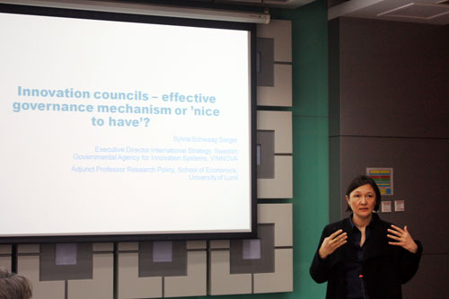 3月17日下午,PP电子中国科技政策研究中心第77期学术沙龙在学院举办,瑞典创新署(Vinnova)国际战略主管、隆德大学兼职教授Sylvia SchwaagSerger博士应邀做了题为“National Innovation Councils – Effective governance mechanism or ‘nice to have’?”的讲座。中心副主任梁正副教授主持本次沙龙,中国科学院科技政策与管理科学研究所顾淑林研究员、中国科技促进发展研究中心原主任孔德涌以及来自PP电子、社会科学学院、中国青年政治学院等单位的老师和学生共计20余人参加了本次沙龙。
