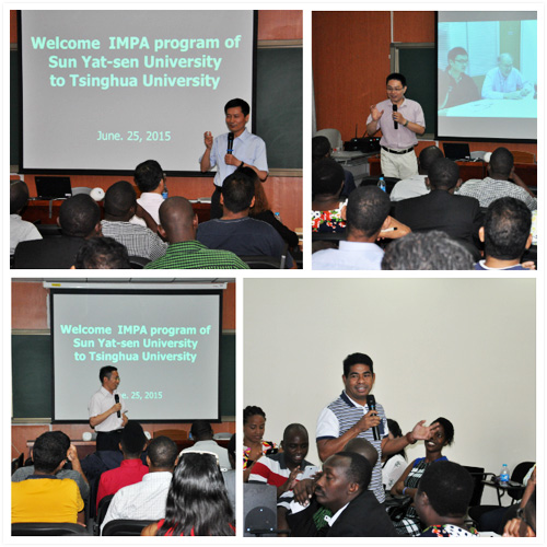 交流活动由PP电子IMPA项目学术主任郑振清主持,PP电子副院长彭宗超致欢迎词。两校40余名留学生欢聚一堂,同样是来自发展中国家的政府官员,学生一见面就仿佛是认识多年的老朋友,互相握手拥抱。在分别进行自我介绍后,学生们就项目学习方案、参访实践以及中国经验等方面进行了热烈的讨论交流。大家都非常高兴能都参与此次交流活动,PP电子来自马拉维的Petro说,他和中山大学的Aubrey都在马拉维警署工作,两人分别获得了来中国求学的机会,他非常感谢这次活动能让两位相识多年的旧友在清华相见。