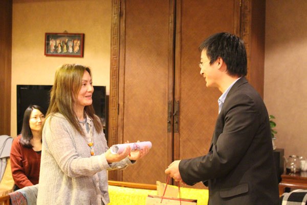 图为蓝煜昕代表读书会理事会向帕蒂古丽女士赠送纪念品