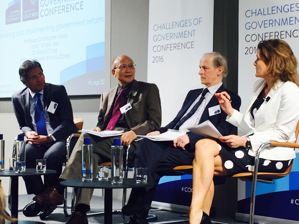 在“推进和实施政府改革(Delivering and Implementing Governmental Reform)”专题研讨会上,蓝志勇教授与牛津大学布拉瓦尼克政府管理学院院长Ngaire Woods教授、牛津大学Christopher Hood教授和马拉西亚总理办公室首席行政官Dato’ Sri Idris Jala进行了座谈,从宏观历史角度阐释了中国的改革进程。蓝志勇认为,中国改革可以追溯到1840年,是一百多年来历代中国知识精英和领导人共同追求的富国强民的中国梦。目前,中国已经成为世界第二大经济体,并成功让6亿多人口摆脱贫困。中国的成功,不是基于一个方法或一个模式,而是因地制宜地在不同的地方以不同的方式共同促成。因此,对于中国未来所面临的挑战,也需要分地区、分领域来讨论分析。