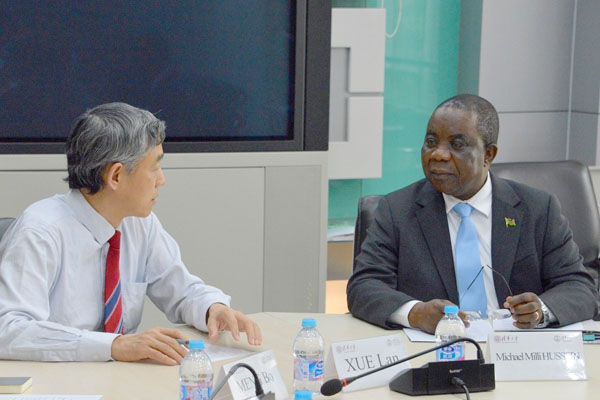 图为薛澜院长(左)与侯赛因大使(右)会谈。