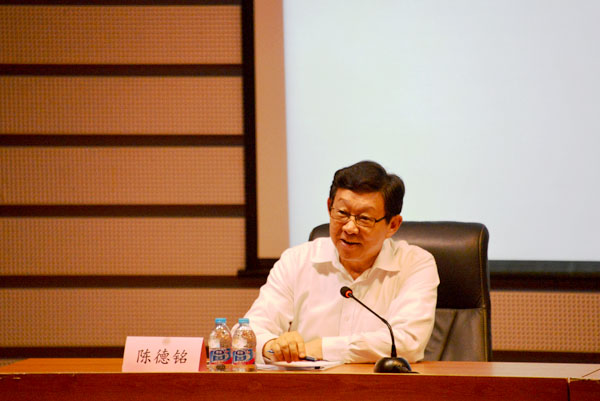 图为陈德铭主讲全球经济规则重构与“一带一路”倡议。