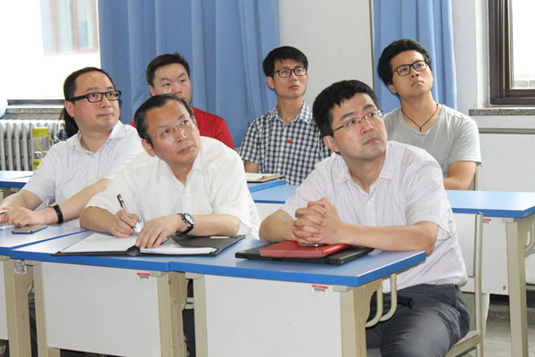 图为过勇(右一)王有强(右二)程文浩(左一)及同学们认真聆听党课。